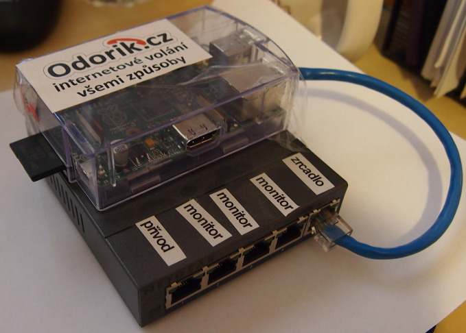 Je to Rasperry Pi spolu se speciálním switchem (např.NETGEAR GS105E) fungující v režimu mirror. Do portu označeného jako přívod se připojí kabel směrem k internetu a do portů označených monitor můžete zapojit až tři VoIP zařízení, která mají být sledována. Switch pak zasílá kopie všech paketů, které přes něj projdou k Raspberry Pi a to může pakety ukládat a analyzovat.
